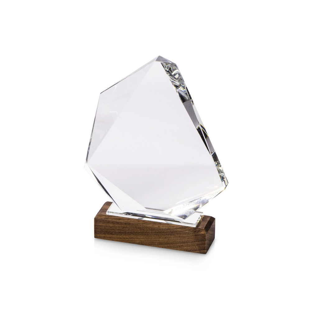 Награда выполнена из прозрачного стекла, имеет интересную асимметричную форму и расположена на деревянном постаменте. Вставка из синего стекла между основной частью и основанием позволяет награде бликовать синим цветом в зависимости от угла падения света. • Интересная форма • Синяя стеклянная вставка между основной частью и основанием • Деревянная подставка