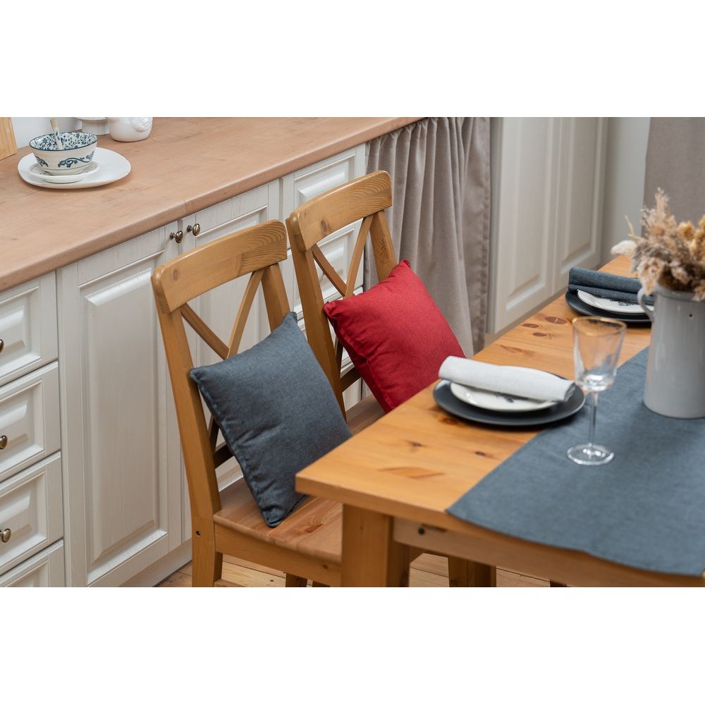 Износостойкая ткань, имитирующая лен, обработана пропиткой от грязи и воды, что делает ее применение для кухни и дома практичным, а уход — легким.