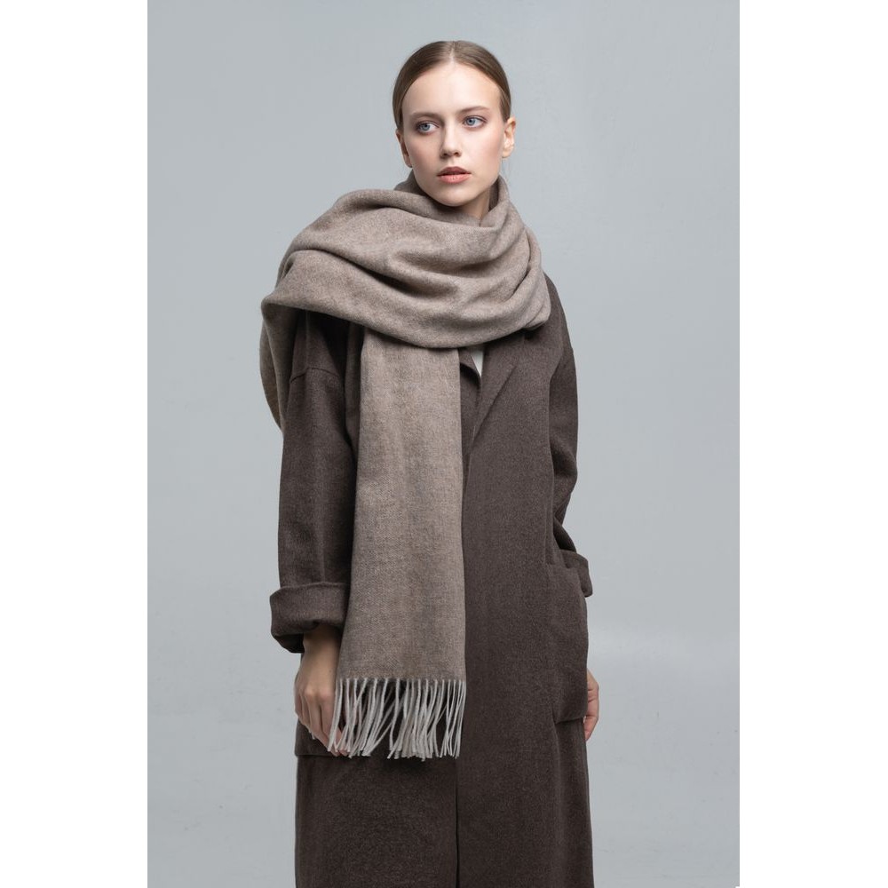 Широкий палантин с едва заметным узором плетения открывает простор фантазии — его можно использовать как шарф, головной убор или декоративный элемент для верхней одежды.