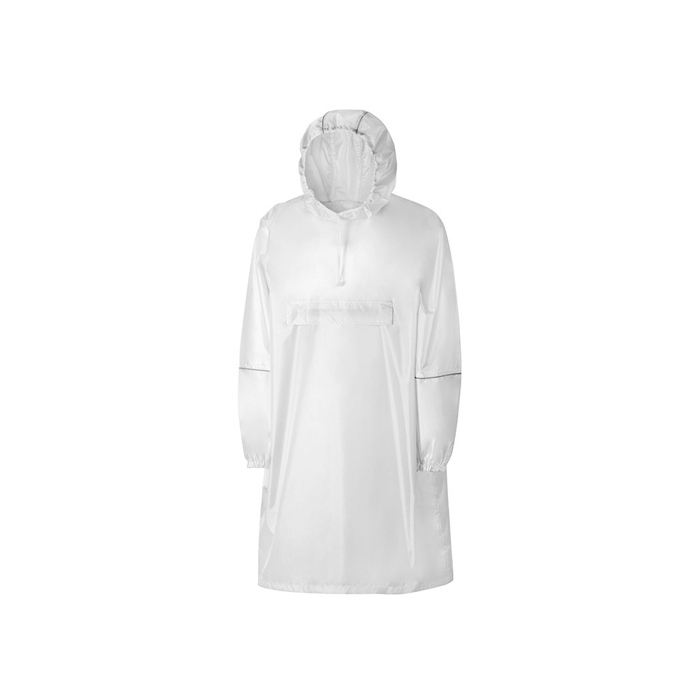 Дождевик - пончо прямого силуэта. Нагрудный карман плаща закрывается на молнию, которая дополнительно защищена клапаном, а еще в него можно полностью убрать дождевик. На дне кармана — ручка-петелька, которая в сложенном виде может использоваться для подвешивания. Швы капюшона и рукавов отделаны светоотражающим кантом, который делает человека заметным даже в темное время суток. Для комфортной посадки — затягивающийся на шнурок капюшон с фиксатором и манжеты на резинке.