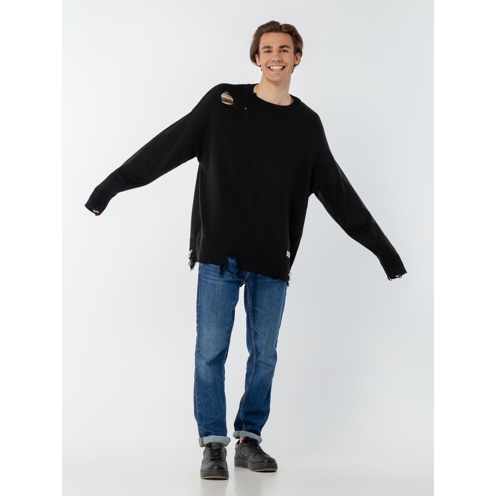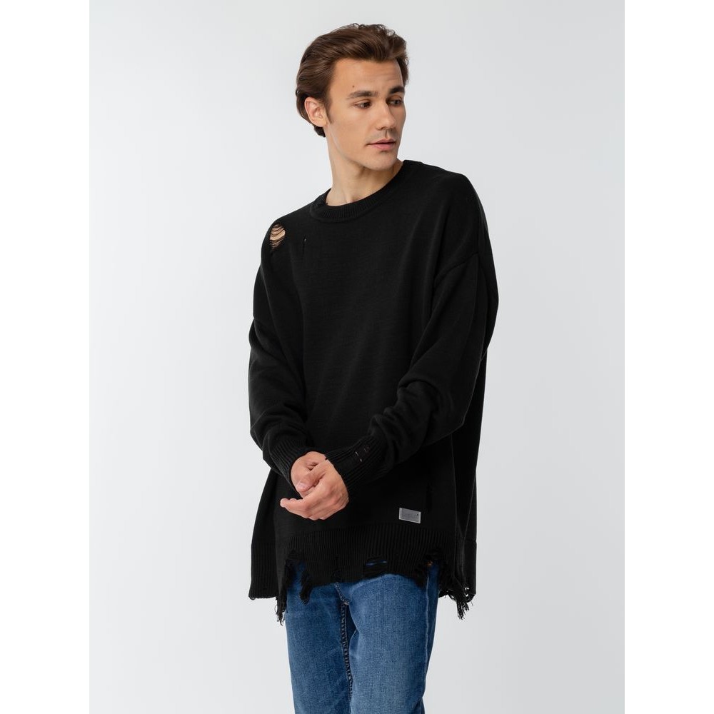 Оверсайз джемпер с круглым вырезом и рваными краями. Ворот, манжеты и низ изделия выполнены резинкой.