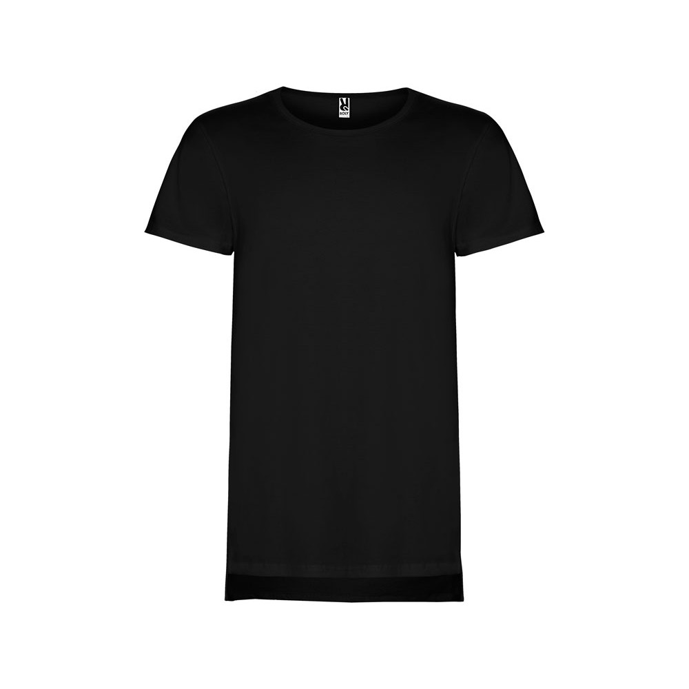 Удлиненная футболка с коротким рукавом. Круглый вырез, разрезы в боковых швах, спинка длиннее полочки.