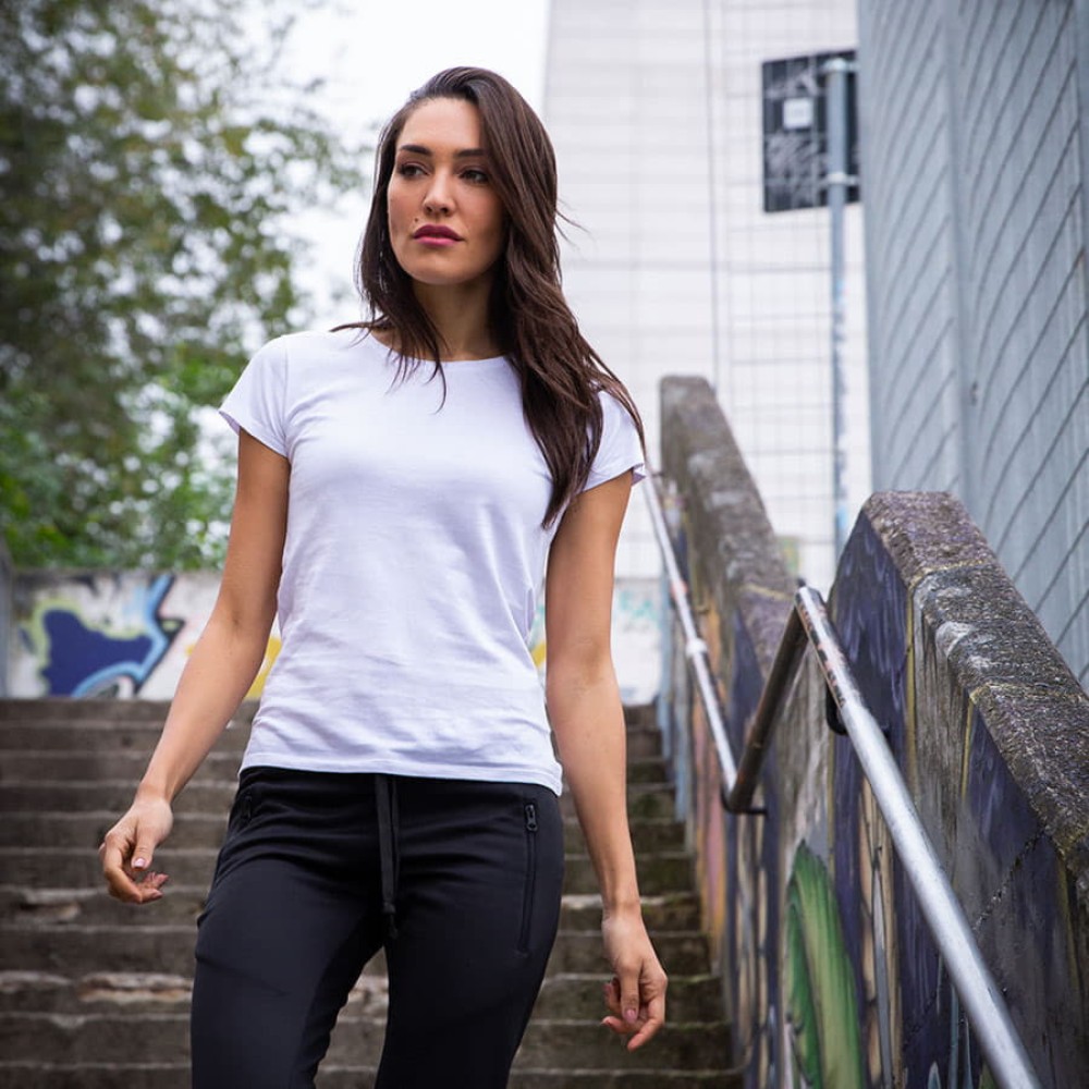 Итальянские женские футболки Сalifornia Lady бренда JRC выполнены из 100% чесаного хлопка (англ. сombed cotton) – чрезвычайно мягкого варианта хлопка, изготовленного путем специальной обработки хлопковых волокон. В процессе производства чесаного хлопка удаляются любые загрязнения, пух и самые короткие волокна, а самые здоровые, длинные и тонкие оставляются. После подобной обработки пряжа становится тоньше, ровнее и крепче, что делает футболку Сalifornia более износостойкой.