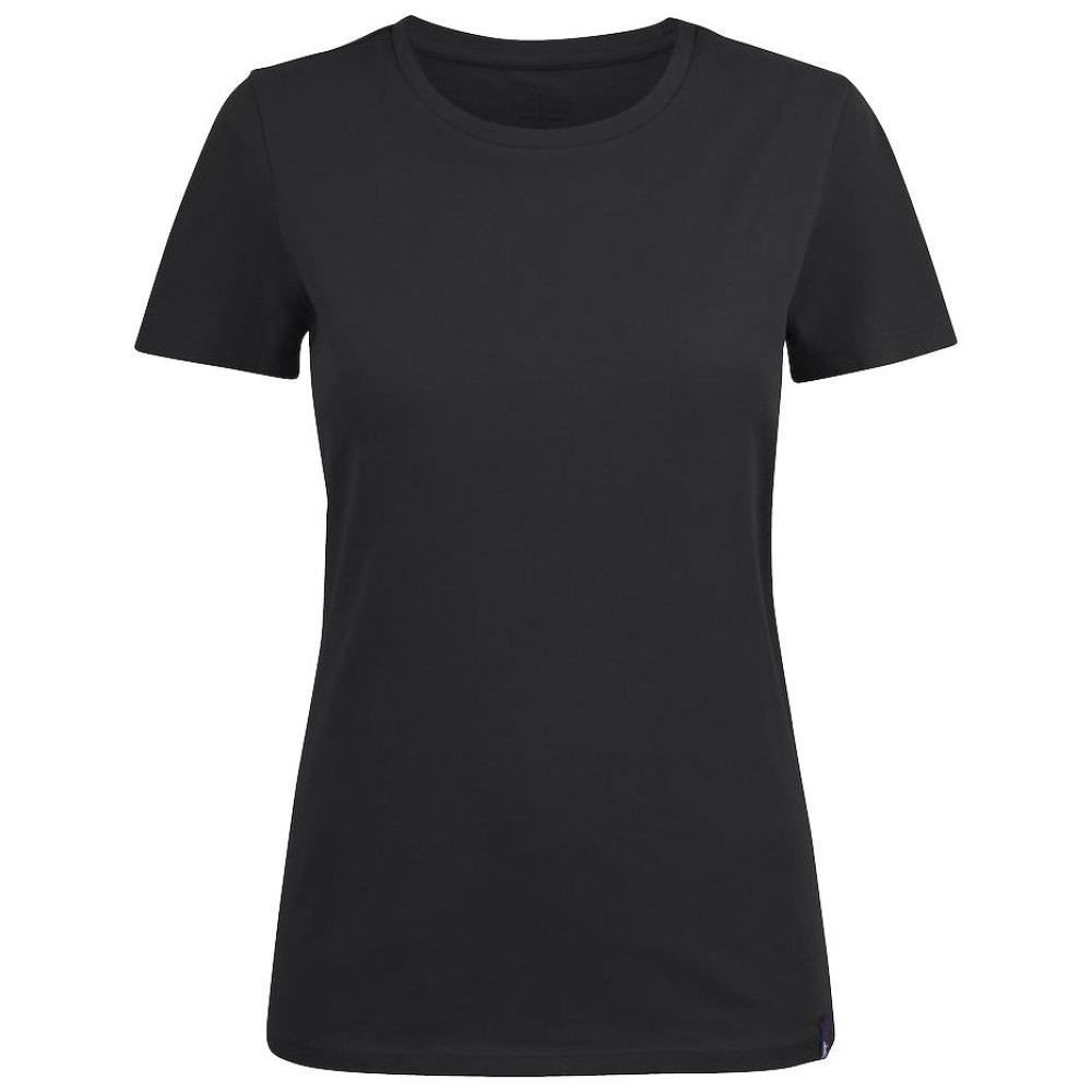 Женская футболка с круглым вырезом. Двухслойная резинка предохраняет воротник от деформации после стирки.