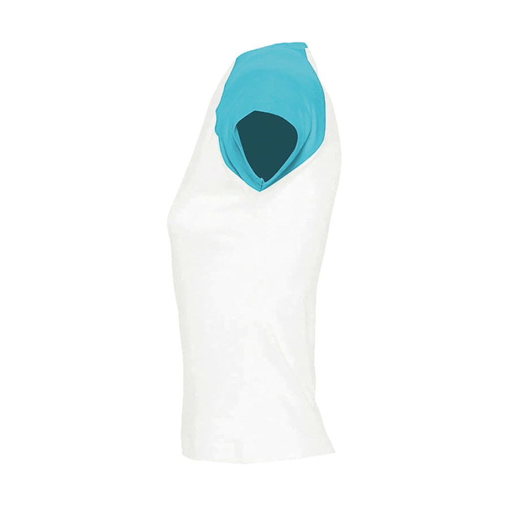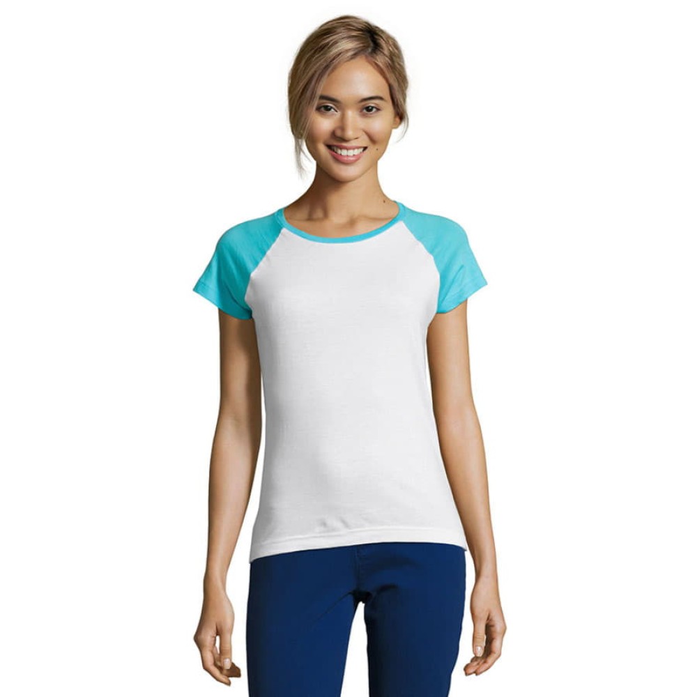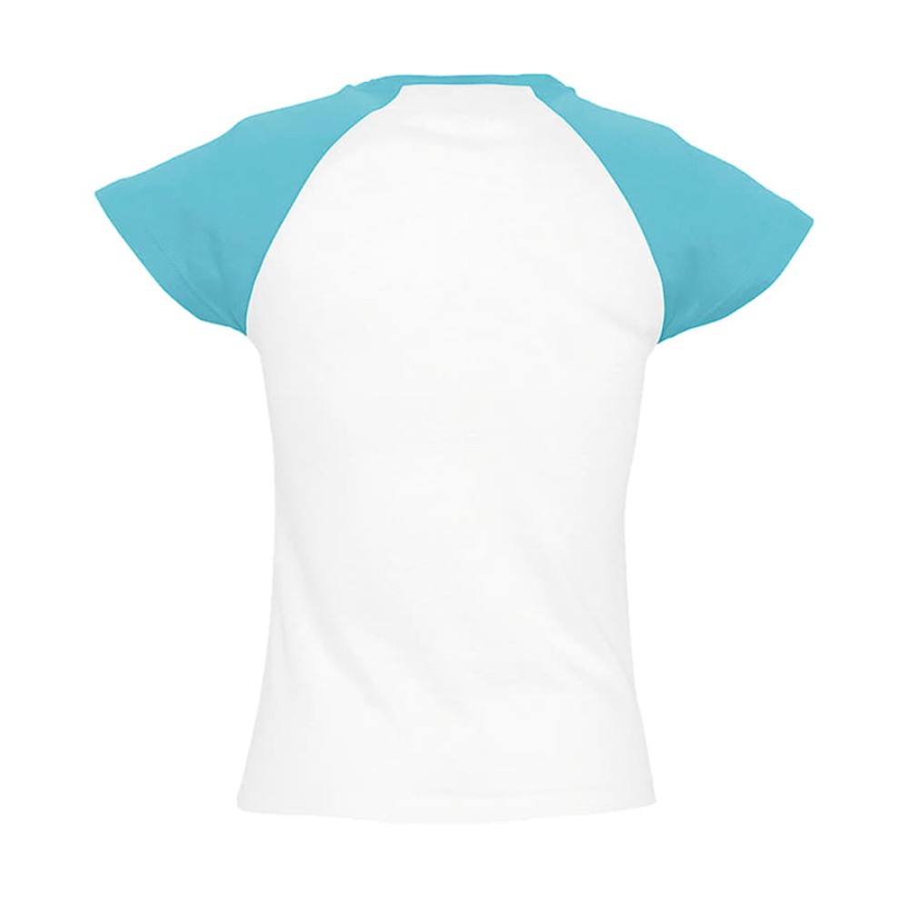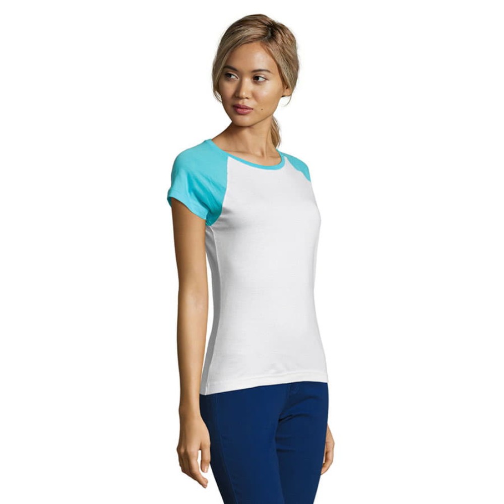 Двухцветная женская футболка MILKY является парой к мужской футболке FUNKY. Благодаря констрастирующим цветным коротким рукавам реглан она выглядит оригинально и стильно, а отсутствие боковых швов обеспечивает широкое поле для печати любого креатива.