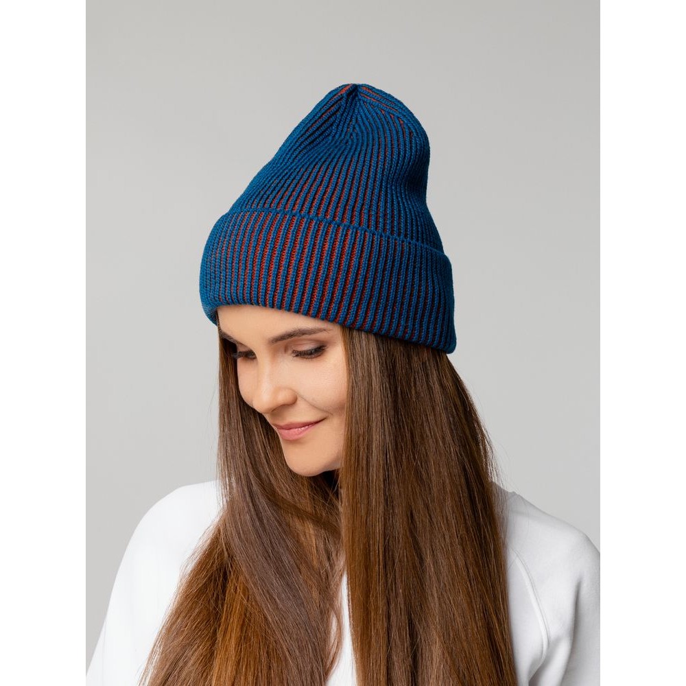 Удлиненная двухцветная шапка из полушерстяной пряжи идеально подходит для создания яркого и современного городского образа и будет удачно смотреться с верхней одеждой разных стилей.