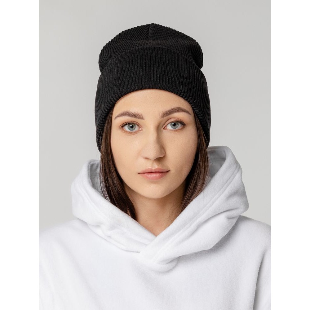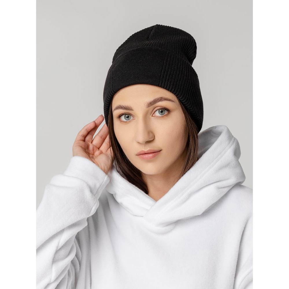 Двухслойная шапка фактурной вязки с отворотом и специальной более гладкой областью под вышивку.