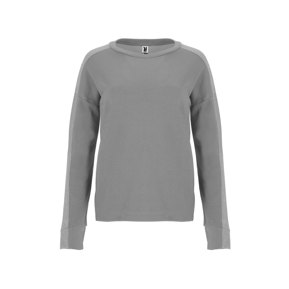 Блокинговый свитшот для женщин из двух цветов одного полотна. Горловина, манжеты и низ спинки из риба 2х1. Манжеты асимметричной формы. Разрезы в боковых швах, спинка немного длиннее переда.