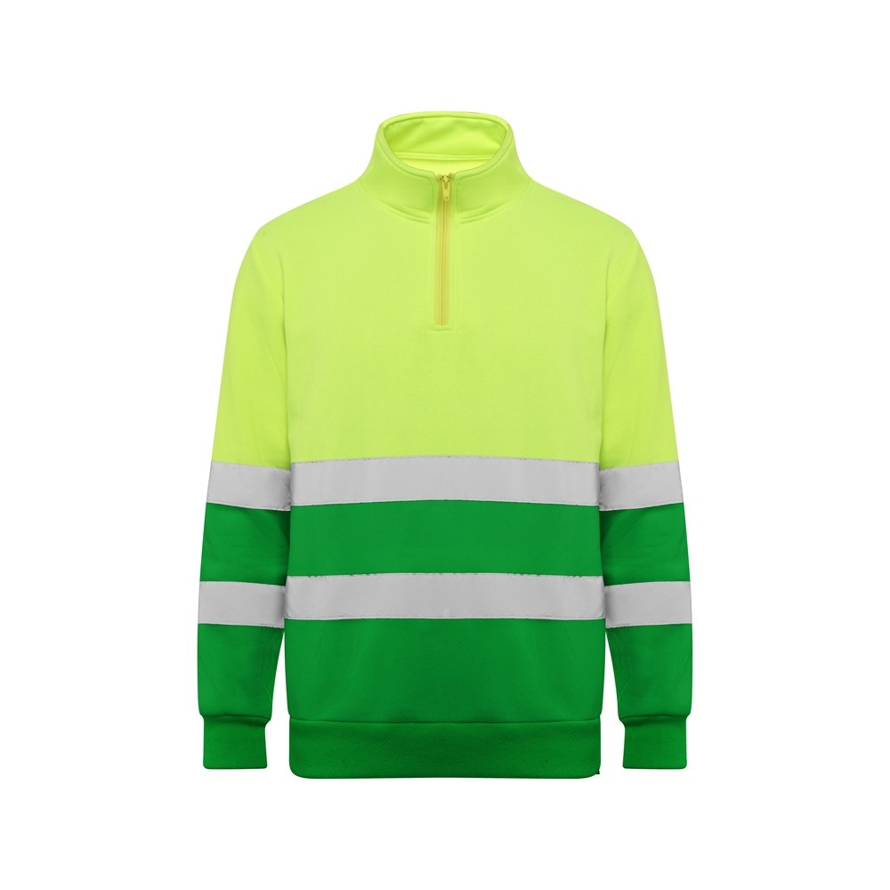 Свитшот с воротом на молнии, предназначен для использования в условиях плохой видимости. Внутри воротника отстрочка для усиления. Горизонтальные полоски со светоотражением на груди и рукавах. Манжеты и низ из рибовой ткани 1х1.