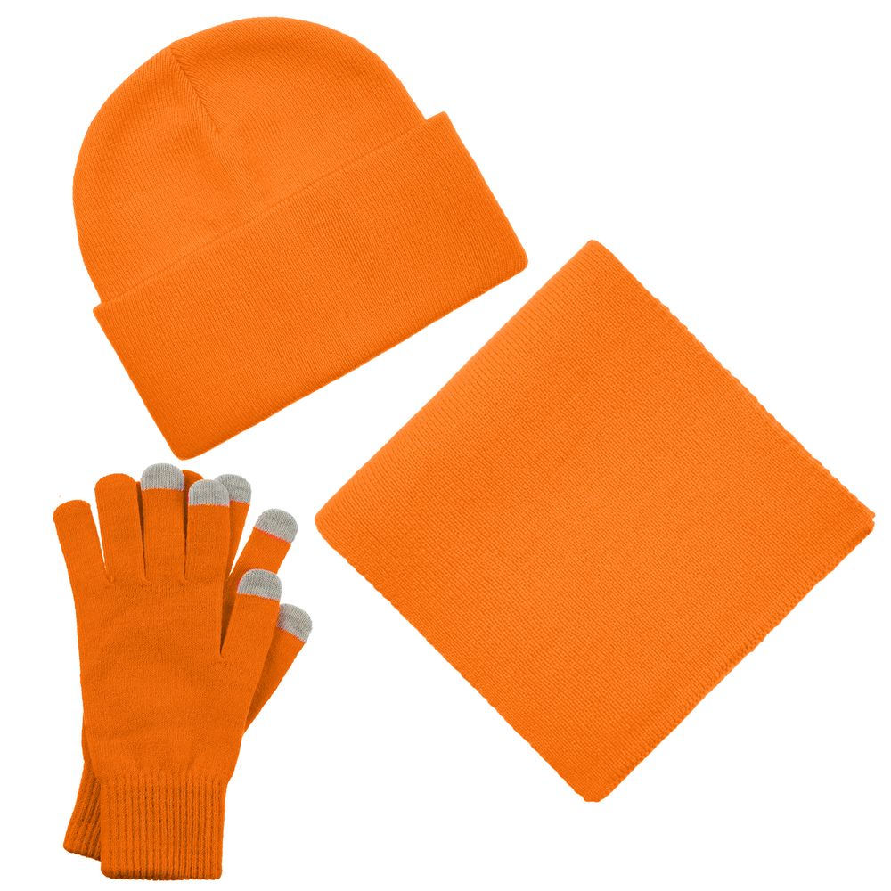 В комплект входят двухслойная шапка с регулируемым отворотом и легкий однослойный шарф из мягкой акриловой пряжи, сохраняющие тепло и защищающие от ветра, а также эргономичные перчатки со специальными токопроводящими волокнами на кончиках пальцев, в которых можно свободно пользоваться смартфоном даже в холодную погоду. Универсальная цветовая гамма и лаконичный дизайн делают набор органичным дополнением к любой верхней одежде.