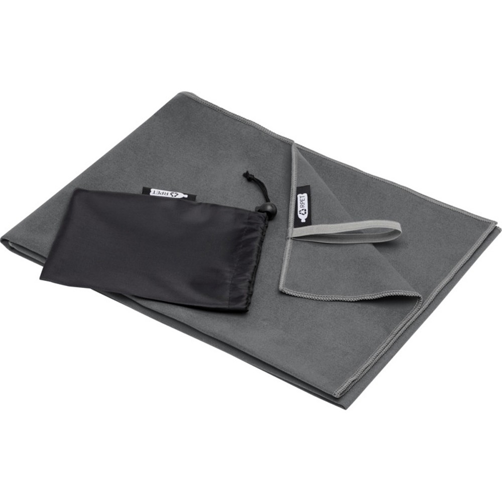 Спортивное полотенце Pieter очень хорошо впитывает влагу, легкое, быстро сохнет, а ткань прочная и очень мягкая. Когда полотенце сложено и закреплено резинкой, оно уменьшается до небольшого размера, поэтому его удобно брать с собой в тренажерный зал, бассейн, на пешую прогулку или в поход. Полотенце размером 50 х 100 см изготовлено из 90 % переработанного полиэстера GRS и 10 % нейлона. Его можно стирать в стиральной машине при температуре 40 °C. В комплект поставки входит мешок для хранения (17 x 13 см), изготовленный из переработанного ПЭТ-пластика, обеспечивающий большую площадь для печати логотипа. 90% Переработанный Полиэстер, 10% Нейлон, 200 g/m2.
