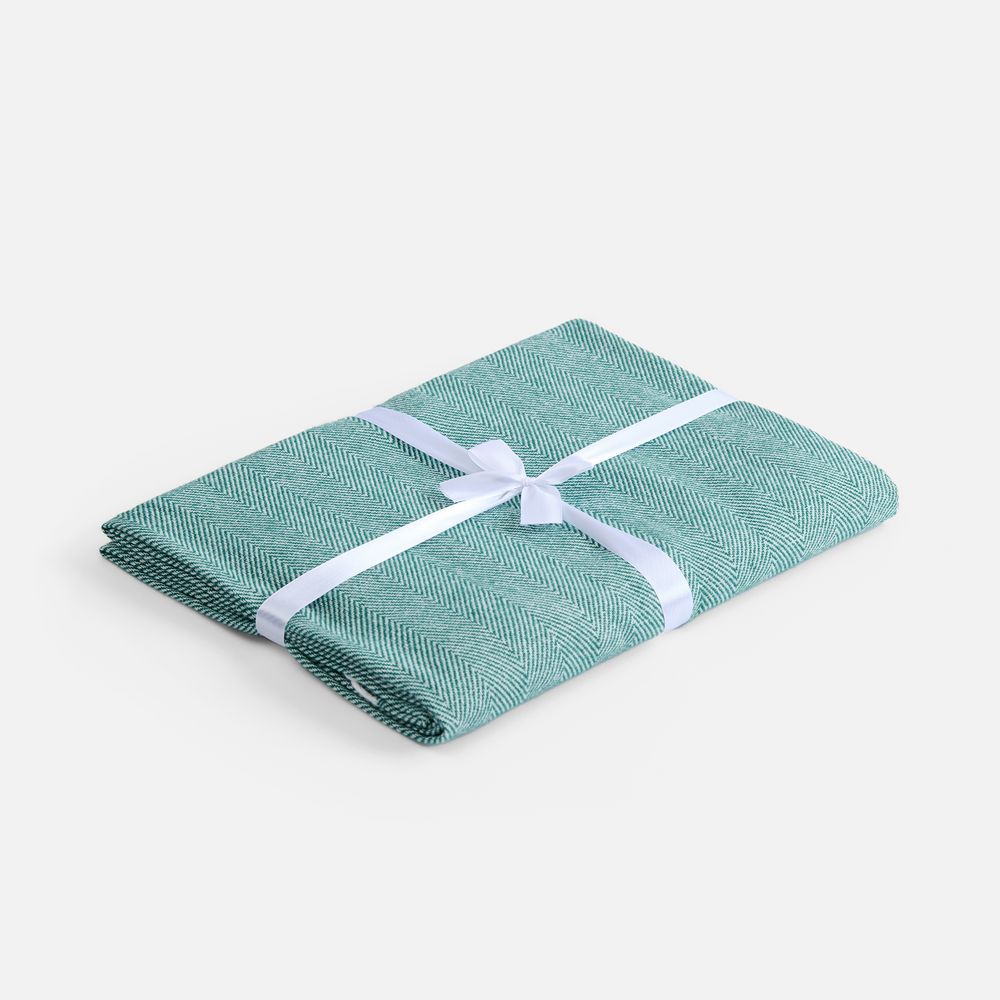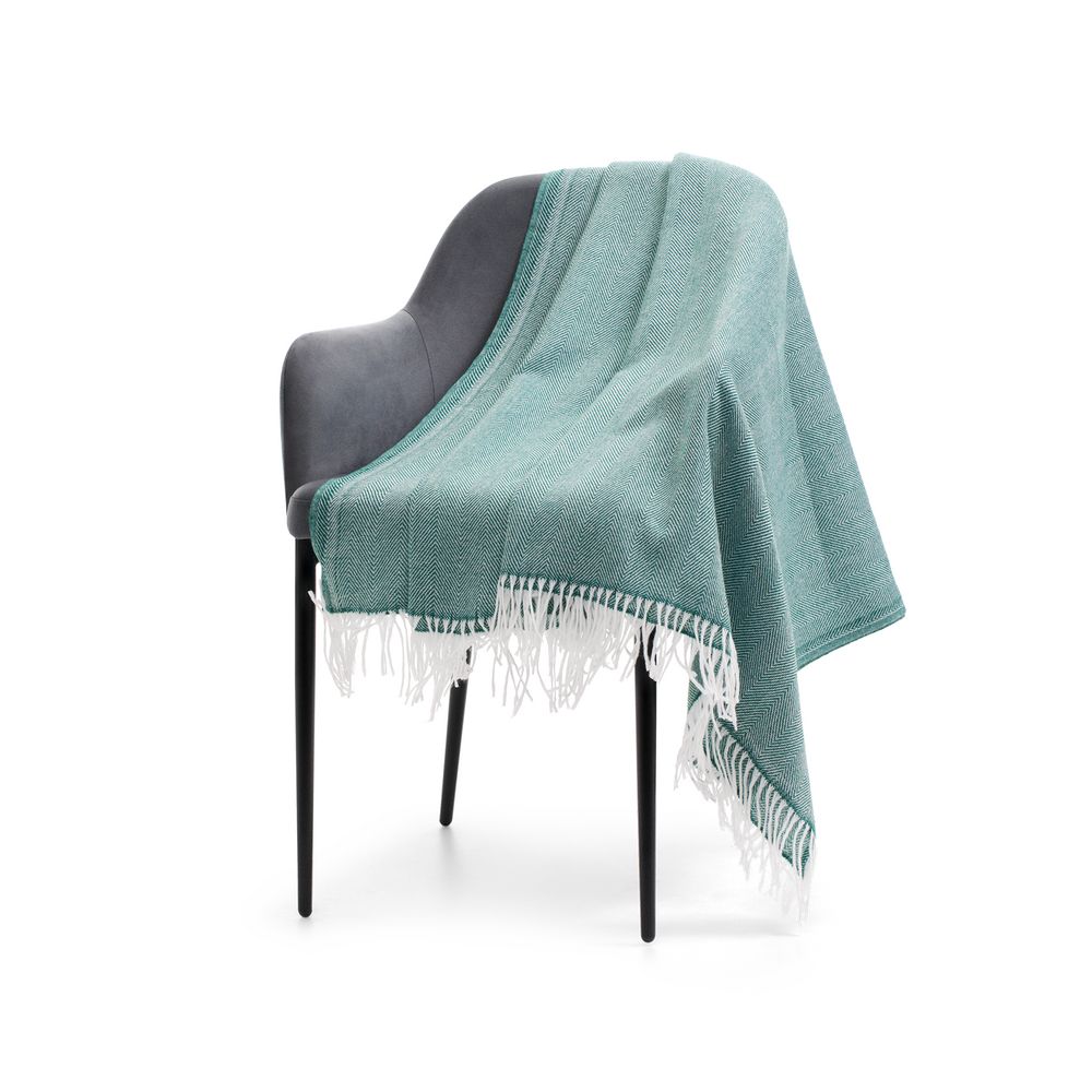 Классический рисунок «елочка» не слишком привлекает внимание, но в то же время добавляет изюминки. Смешанный состав пряжи продлевает срок службы и существенно облегчает уход за пледом.
