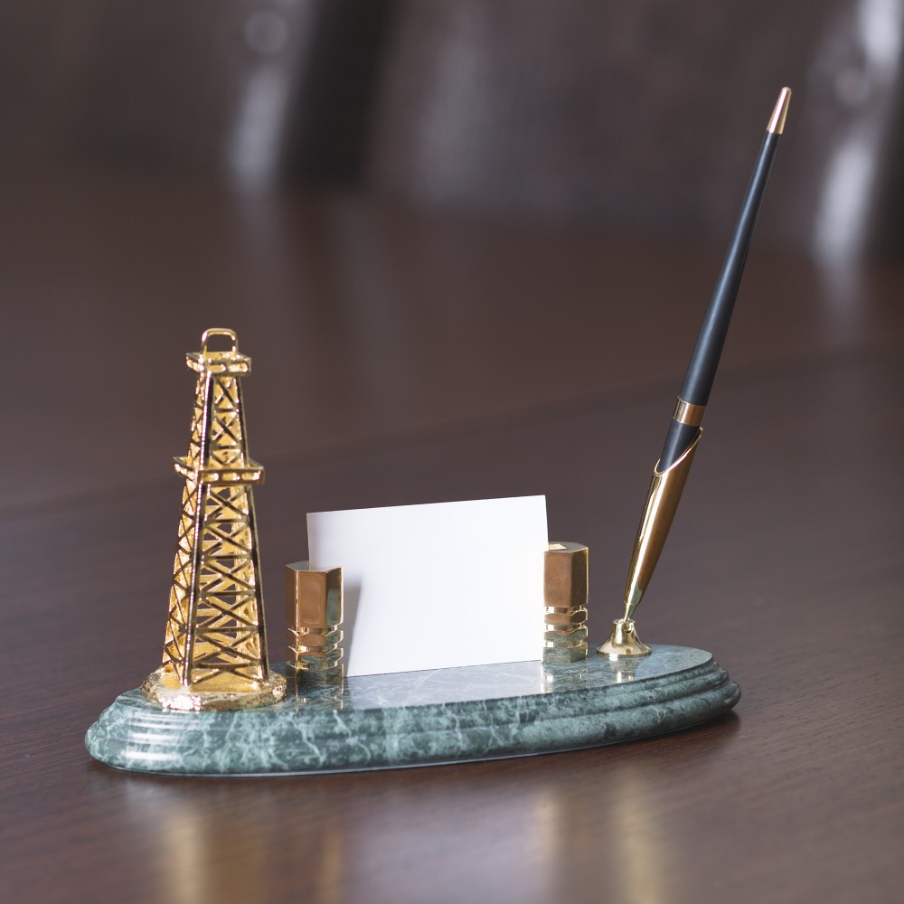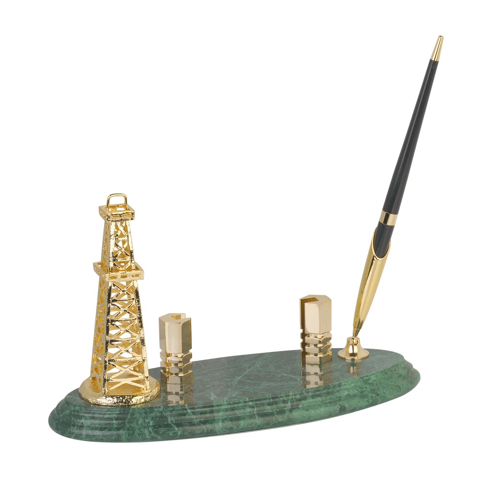 • Подставка под визитки "Нефтяная вышка" с ручкой, золотистый с зеленым