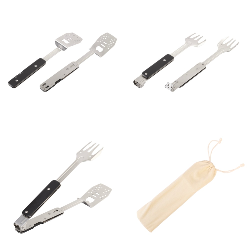 4 аксессуара: лопатка, вилка, щипцы и открывашка в одном инструменте. Размер в сложенном виде всего 6 х 22,5 х 2,6 см, в комплекте есть чехол из хлопка для хранения.