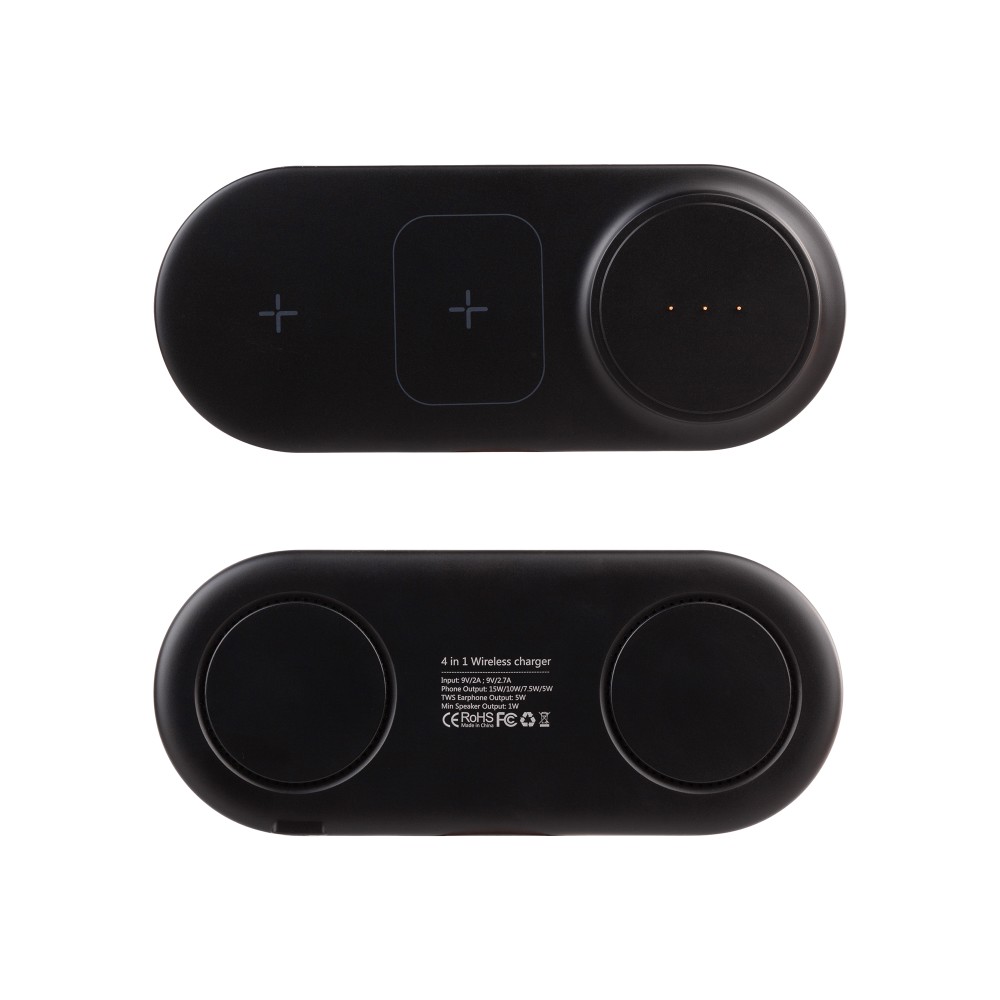 Комплексное предложение – настольный набор из мобильной bluetooth колонки и беспроводной зарядной станции с увеличенной мощностью передачи заряда (15W) для смартфона и наушников. Эффектное дополнение – круговая подсветка логотипа на корпусе колонки.