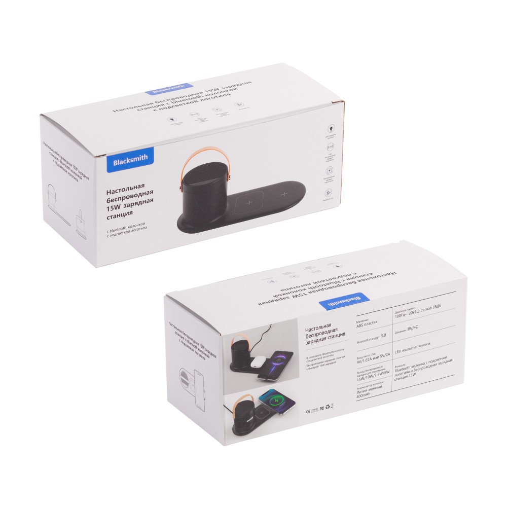 Технические характеристики Настольная беспроводная (15W) зарядная станция "Blacksmith" с bluetooth колонкой с подсветкой логотипа, черный