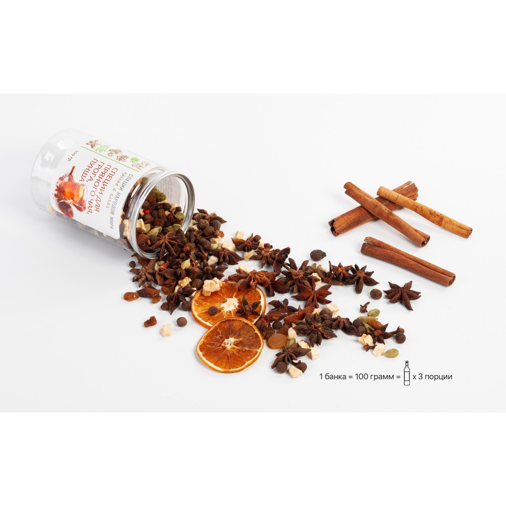 - специи для глинтвейна, пряного чая, пунша, грога 100 гр (3 порции: палочки корицы, бадьян, гвоздика, кардамон, изюм, яблоки сушеные, перец душистый, апельсины сушеные кольцами, перец розовый); h 11 х d 7 см;