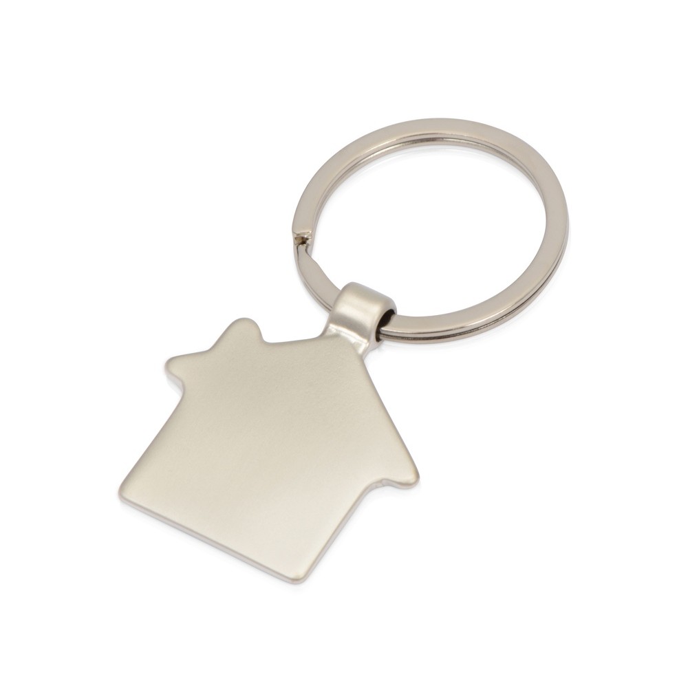 Оригинальный брелок в форме домика. Матовая металлическая поверхность идеально подходит для нанесения логотипа.