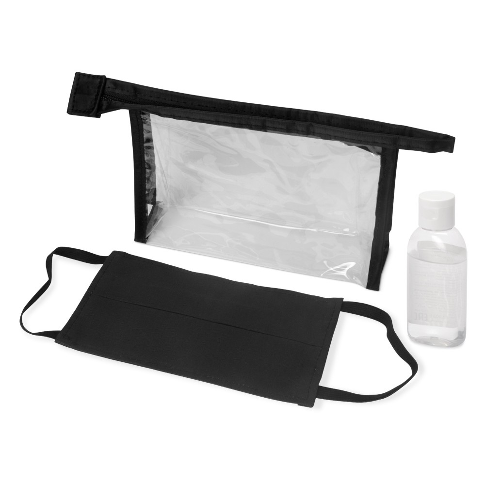 Самое необходимое всегда под рукой - в любом месте и при любой ситуации. Многоразовая хлопковая маска черного цвета и антисептик в стильной пластиковой косметичке поместятся в любой сумке.