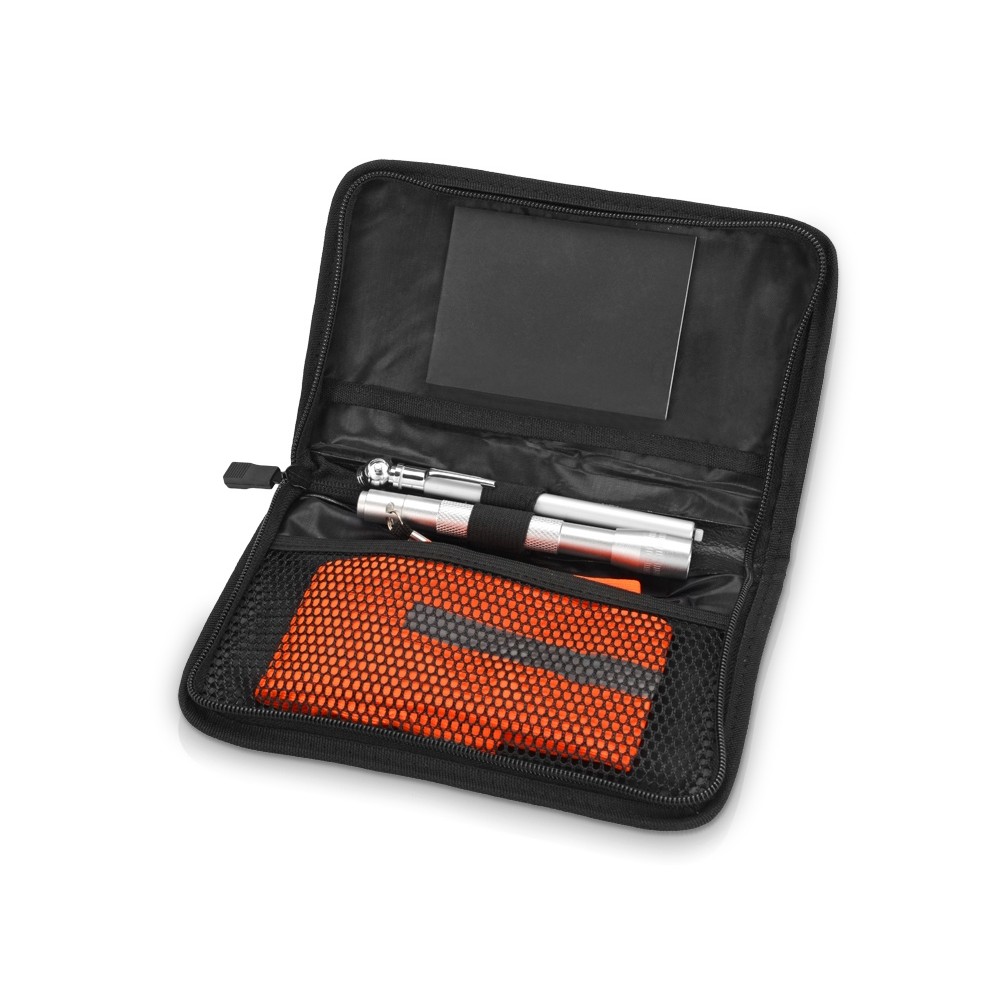 Дорожный набор Favorite пригодится в каждой машине. В автомобильный комплект входят такие полезные вещи как ручка, фонарик, прибор для измерения давления в шинах, блокнот, жилет со светоотражающими элементами.