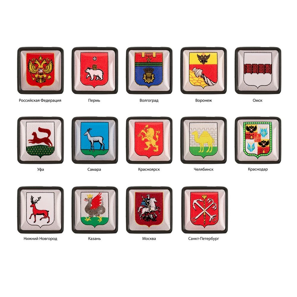 Металлический шильдик с объемной наклейкой под смолой с изображением герба одного из 14 крупных городов Российской Федерации — простой и элегантный способ показать региональную принадлежность компании, обозначить расположение филиалов или напрямую обратиться к клиентам из определенного города.