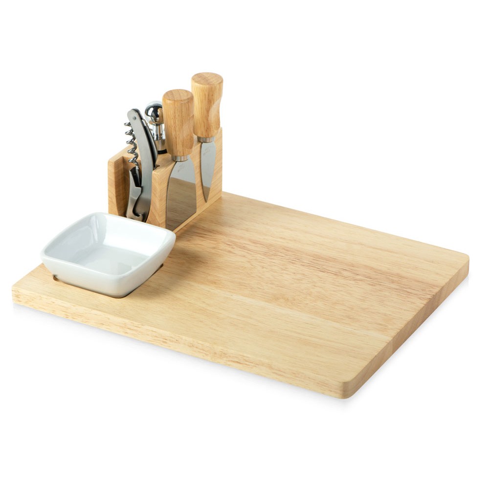 | Вес1190 | Комплектностьразделочная доска / доска для подачи закусок, соусница / емкость для оливок , штопор, пробка для вина, кольцо для винной буиылки, два сырных ножа | Материал товараКаучуковое дерево, фарфор, сталь |