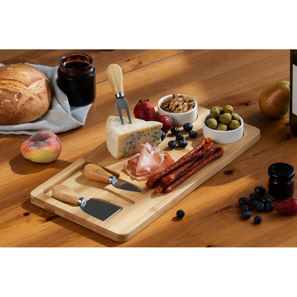 В набор входят доска из бамбука, два керамических соусника, вилка, листовидный нож для сыра твердых сортов, нож-лопатка для мягкого сыра.
