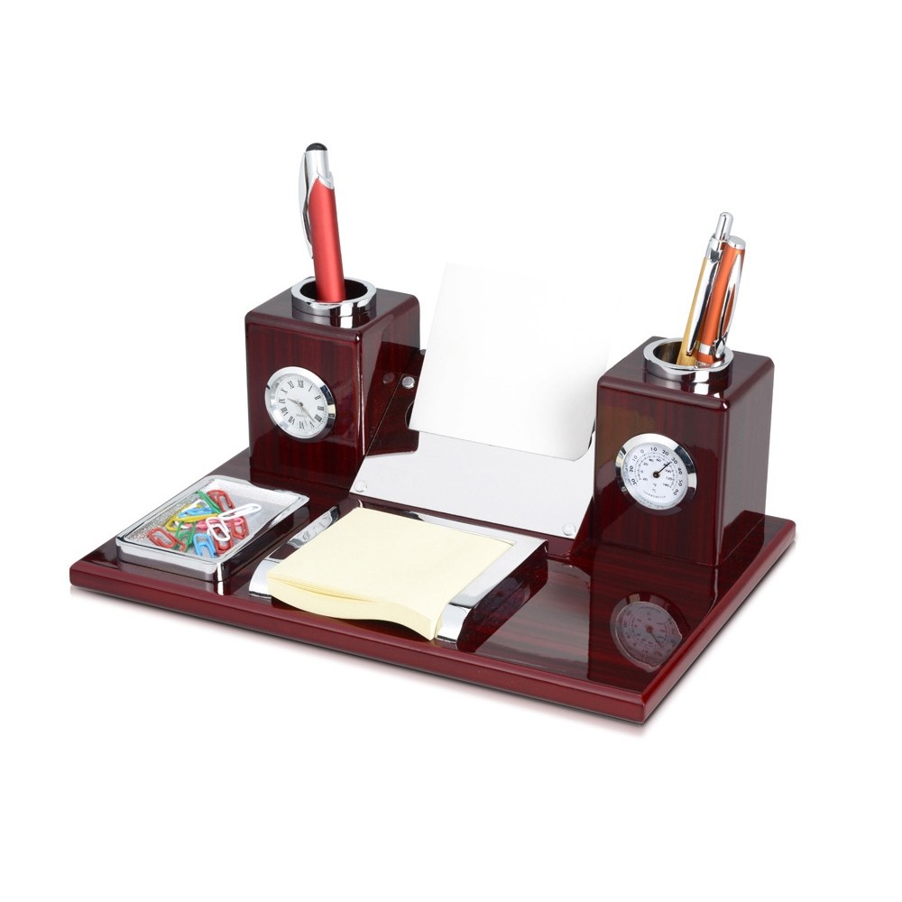 Превосходный набор из дерева благородного оттенка и металла станет отличным подарком руководителю организации. Здесь учтено все, что нужно для плодотворной работы: часы, термометр, подставки под ручки, скрепки, бумажный блок и визитки. Теперь все канцелярские принадлежности будут в порядке.