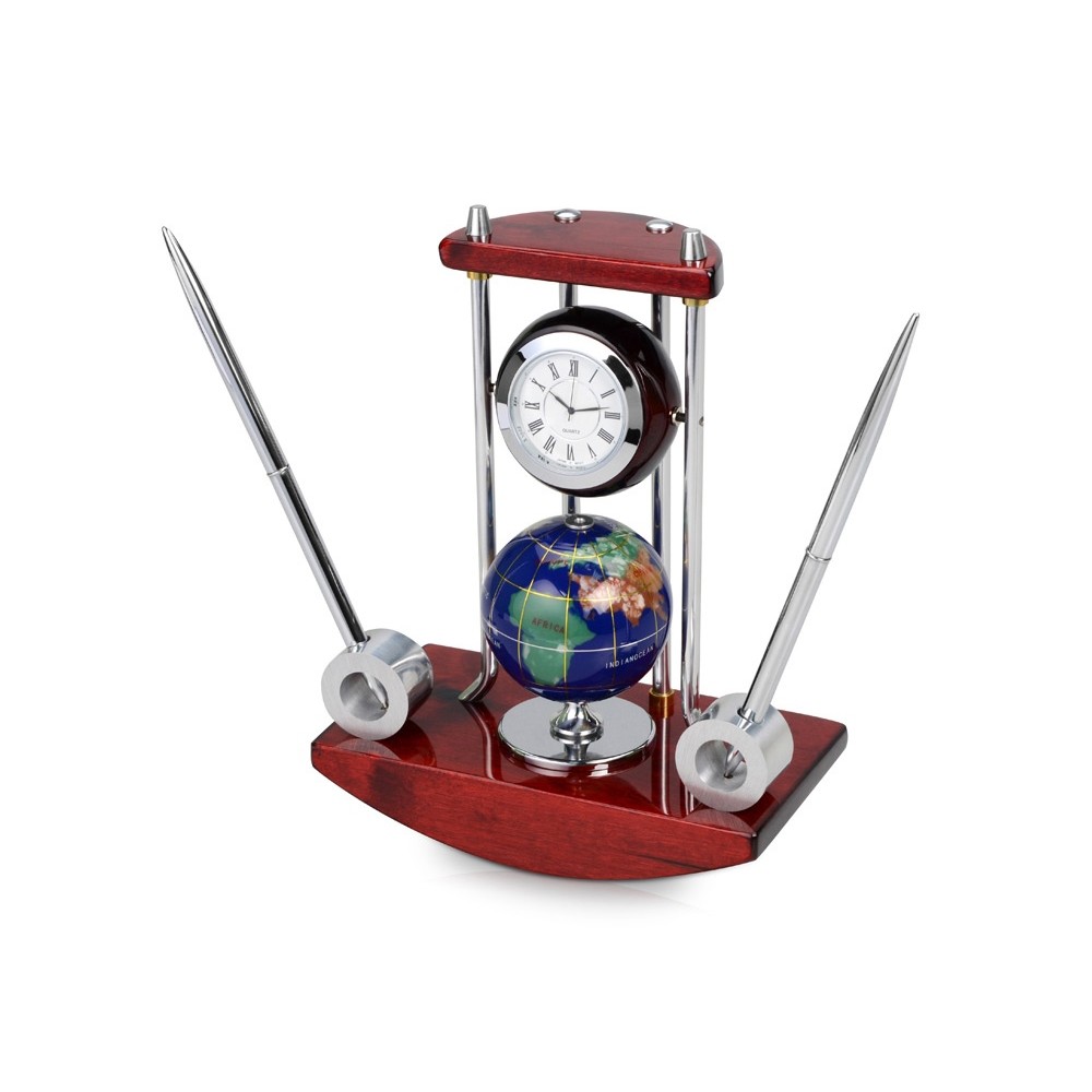 Строгие линии и формы, качественные материалы – это все говорит о продукте представительского класса. Настольный прибор состоит из точных часов, модели глобуса и двух ручек на подставке. На корпус прибора можно нанести гравировку.