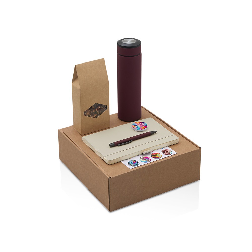 • Подарочный набор с термосом, блокнотом, ручкой и чаем, бордовый