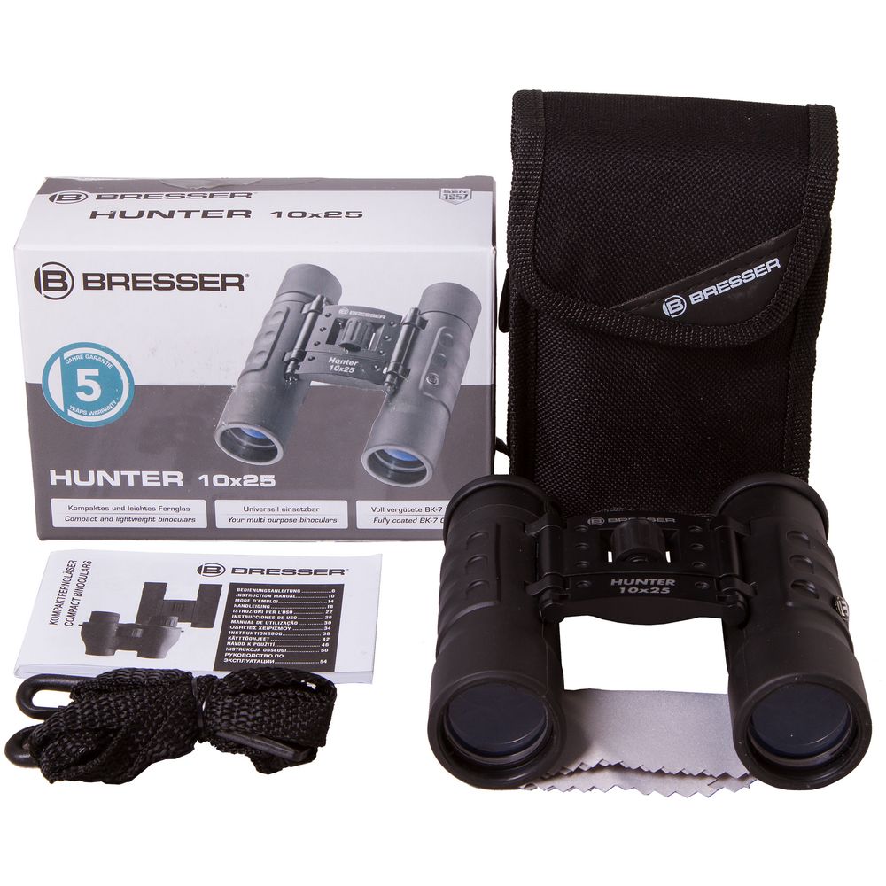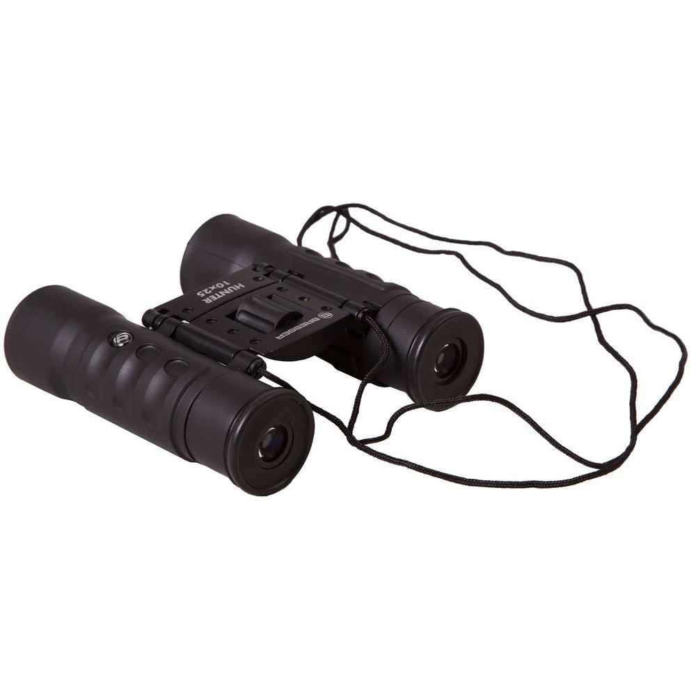 Бинокль создан на базе roof-призм, сделанных из стекла BK-7 c многослойным просветлением. Увеличение — 10x, диаметр объективов — 25 мм. Минимальное расстояние фокусировки — 5 м. Бинокль имеет функцию подстройки межзрачкового расстояния и диоптрийной коррекции окуляров. Встроенная система центральной фокусировки позволит быстро настроить резкость.В комплект входит чехол из полиэстера.