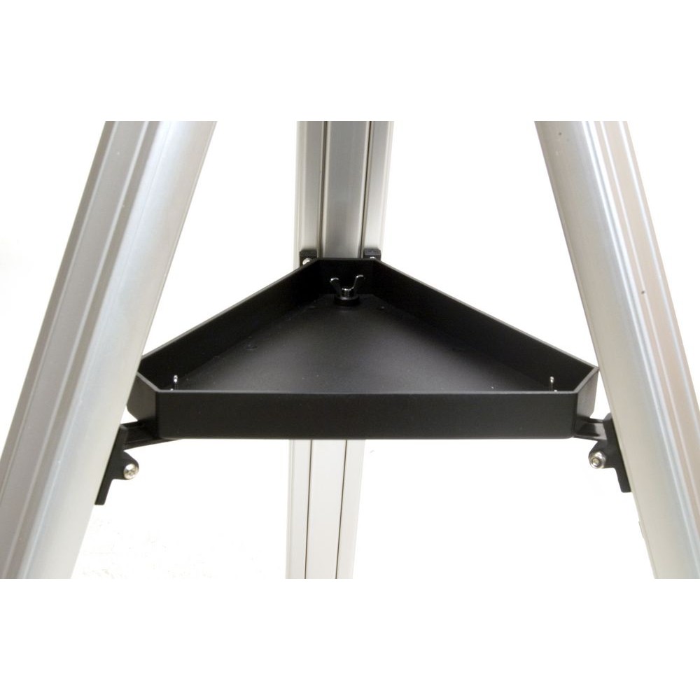 Тренога регулируется по высоте и имеет удобную полочку для принадлежностей. На выходной втулке имеется стандартная Т-резьба, которая через дополнительное переходное кольцо позволяет присоединять к телескопу зеркальную фотокамеру и производить съемку Луны и других ярких объектов.В комплект входит лоток для аксессуаров, крепящийся на треногу.