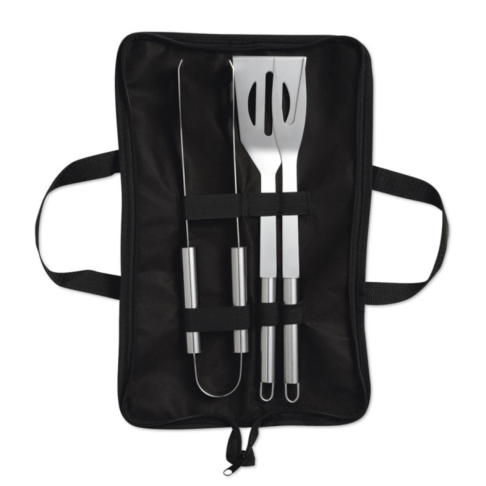 Инструменты для барбекю из нержавеющей стали в черном чехле из нетканого материала.