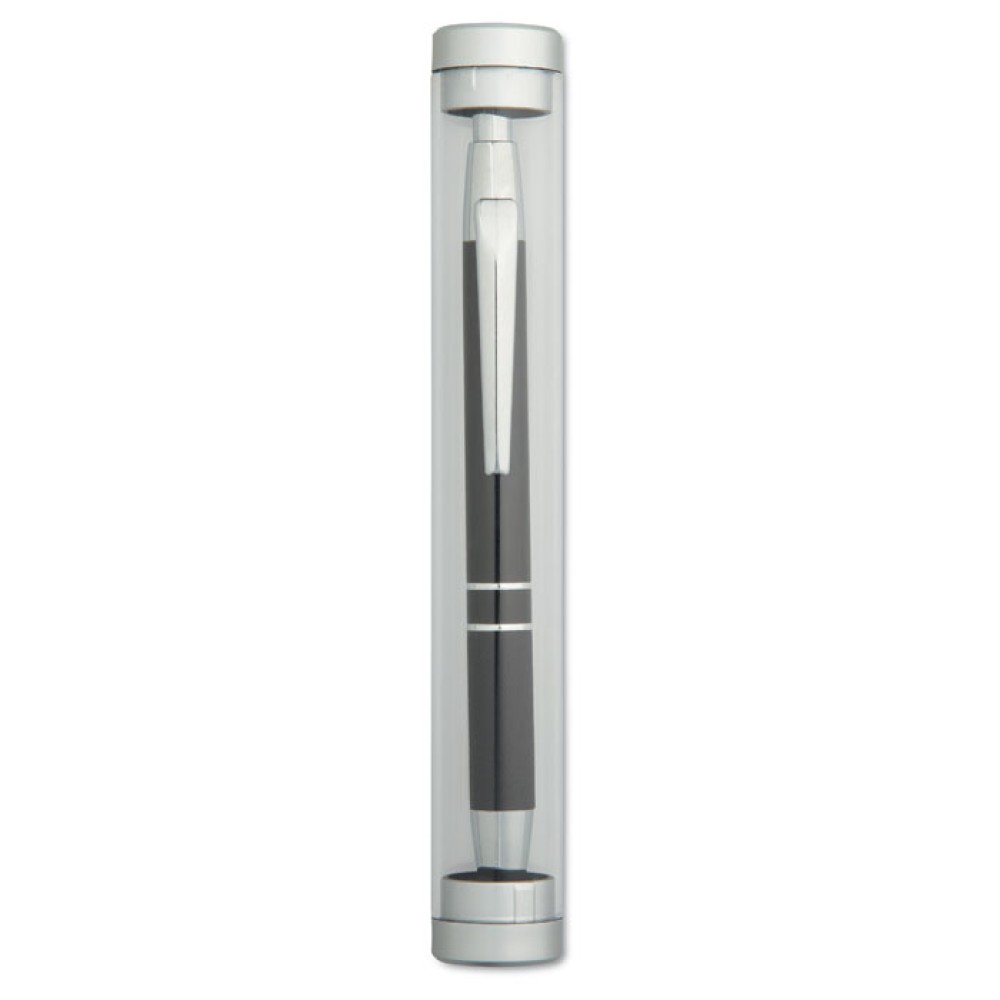 Анодированная алюминиевая нажимная ручка. Прозрачный пластиковый футляр. Синие чернила.