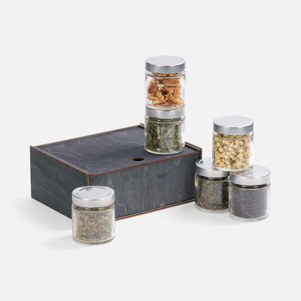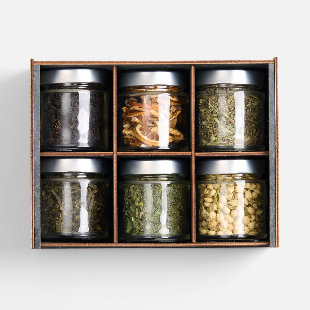 Бутоны жасмина наполняют напиток тонким цветочным ароматом, сушеная мелисса вносит легкую свежесть, чабрец придает пряную нотку, а дольки апельсина — яркую фруктовую кислинку. Смешивая эти ингредиенты на свой вкус, можно стать настоящим чайным мастером, — и каждый раз будет получаться уникальное сочетание, которое отразит текущие предпочтения и настроение. Деревянная коробка‑пенал придает подарку благородный и экологичный вид.