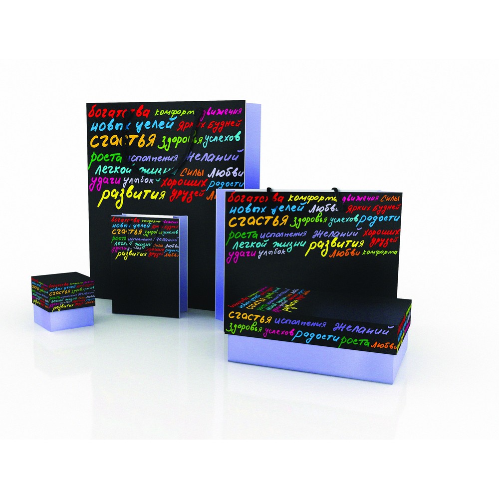 Подарочная коробка совмещает в себе функции упаковки и открытки: на ней уже написаны всевозможные пожелания. Коробка изготовлена с применением лучших полиграфических технологий и заламинирована. На свободном от декора черном поле можно разместить логотип компании, текст или рисунок.Возможные способы и стоимость нанесения логотипа предоставляются по запросу.