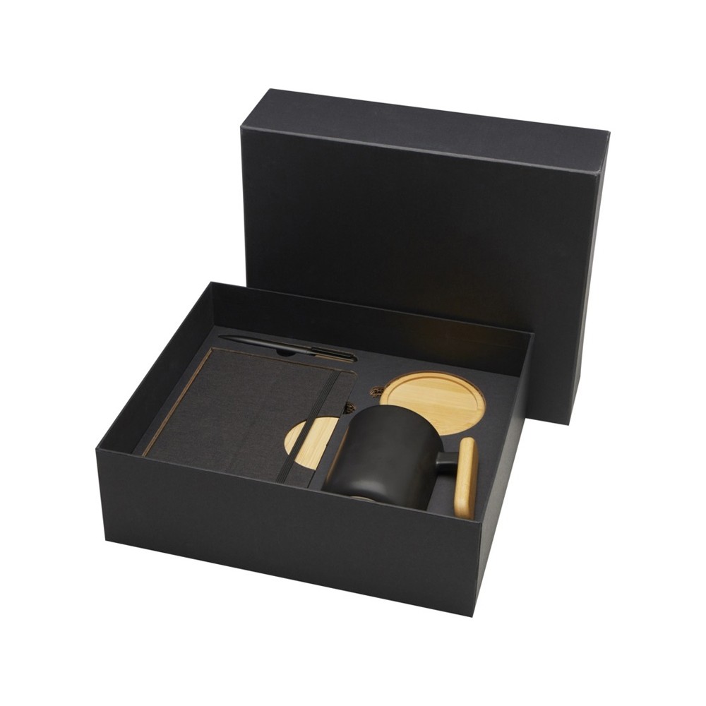 В подарочный набор Laura входит блокнот в твердой обложке RPET формата A5, шариковая ручка, керамическая кружка и подставка. Блокнот имеет черную эластичную застежку и ленточную закладку, а также 80 разлинованных листов бумаги плотностью 80 г/м² кремового цвета. Чехол для ноутбука вместе с бамбуковым полукругом выполняет функцию подставки для телефона. Шариковая ручка изготовлена из переработанного алюминия, сертифицированного RCS, с черным напылением и имеет бамбуковые аксессуары с обеих сторон верхнего корпуса. Чернила для ручки: черный. Длина непрерывной линии: 400 метров. Керамическая кружка объемом 480 мл поставляется с бамбуковой подставкой. Мыть только вручную. Размер кружки: 11 х 12,7 см. Диаметр подставки: 9,5 см. Размер подарочной коробки: 32 x 27 x 10,3 см. FSC certified paper, FSC certified cardboard, Recycled Aluminium. #?0:>2:0: FSC Mix Credit P5.1 CU-COC-877277. FSC Mix Credit P7.1 CU-COC-877277.