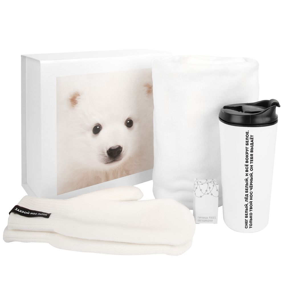 Набор упакован в белую коробку с наклейкой белого медвежонка.