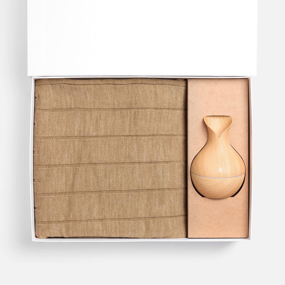 Плед с мягкой текстурой приглашает расслабиться в тепле, а изящный увлажнитель-ароматизатор создает в помещении атмосферу гармонии.