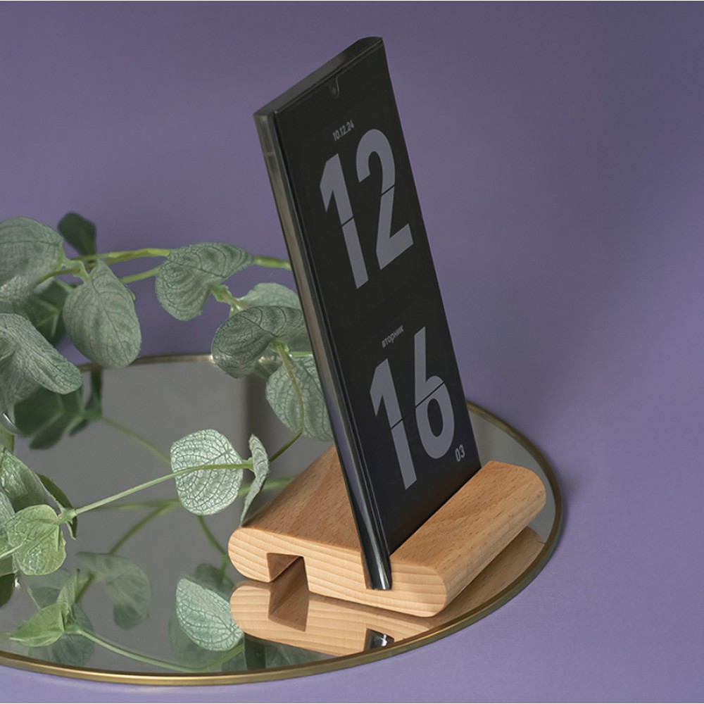 Подставка для телефона/смартфона, две разные выемки позволяют установить в держатель смартфон и/или планшет как в плотном бронечехле, так и без него, при этом смартфон и/или планшет будет хорошо зафиксирован, выполнениз премиум материала бук.