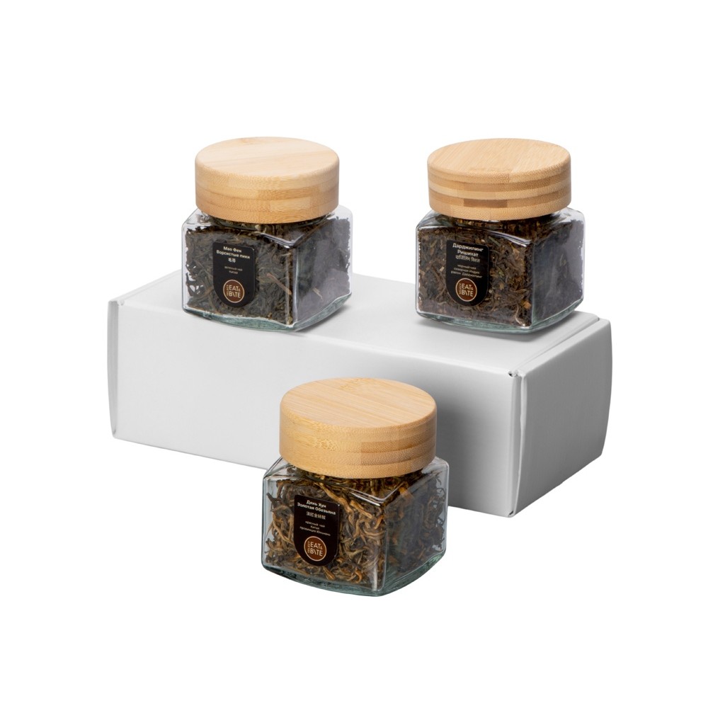 Вес1044 Комплектностьчай Дарджилинг ришихат черный, чай Маофэн красный, чай Жянь хун красный Материал товарабанки -стекло, крышки- дерево