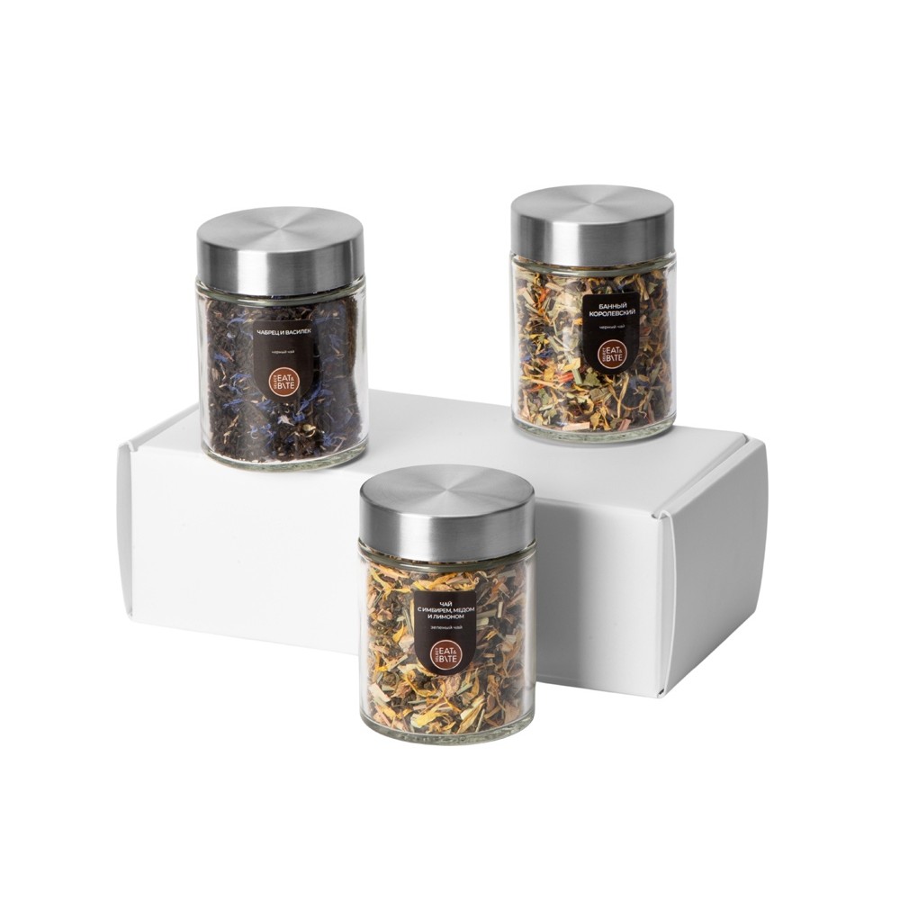 | Вес982 | Комплектностьчай банный королевский черный,чай с чабрецом и лепестками василька черный,чай с медом, имбирем и лимоном черный | Материал товарабанки -стекло, крышки- металл |