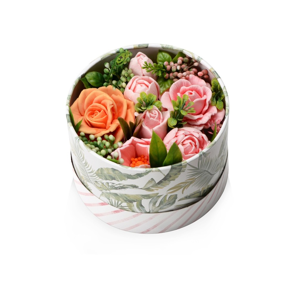 Впечатляющая и изысканная композиция из мыла ручной работы в подарочной коробке. В основе - яркие и реалистичные цветы с нежным ароматом. В композиции также использован флористический декор.