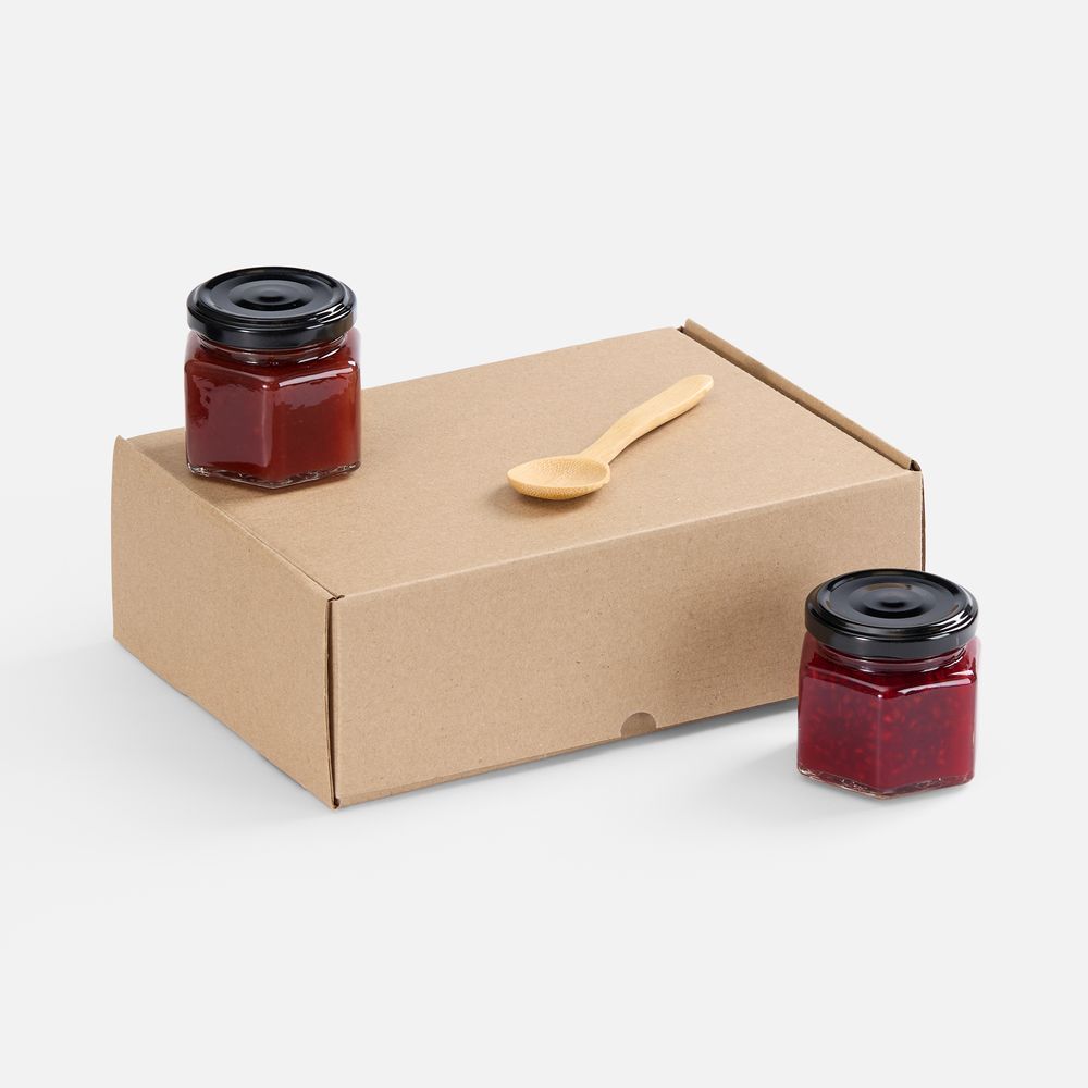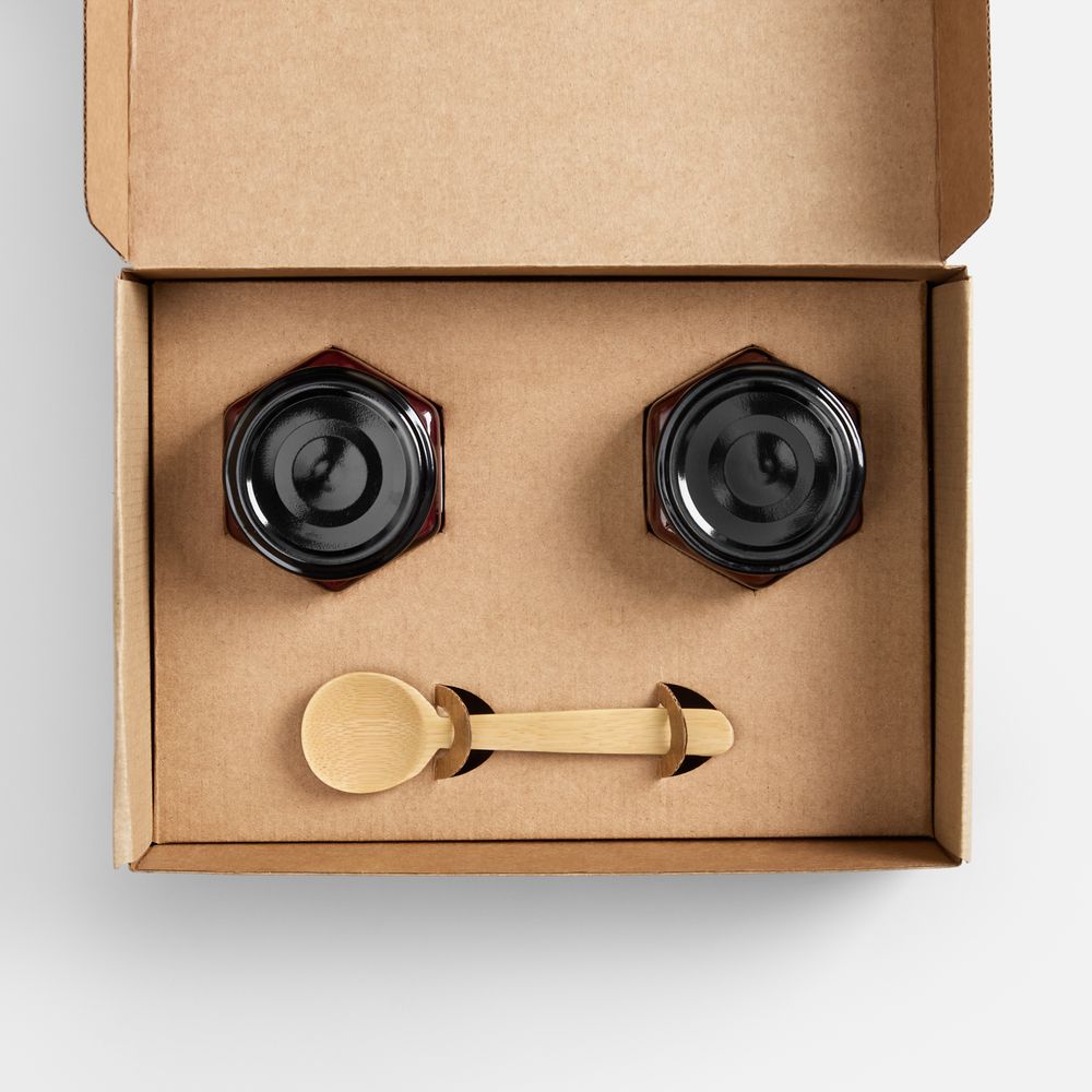 Материал коробка - микрогофрокартон; баночки - стекло, жесть; ложка - бамбук