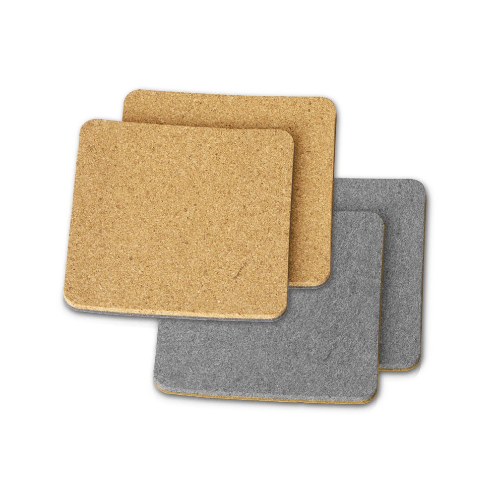 Четыре квадратных костера, выполненных из фетра и пробки. Благодаря выбору материалов посадка стаканов — мягкая и бесшумная: и пробка, и фетр заглушают звук, безопасны и для посуды, и для поверхности стола, защищая от механических повреждений и загрязнения.