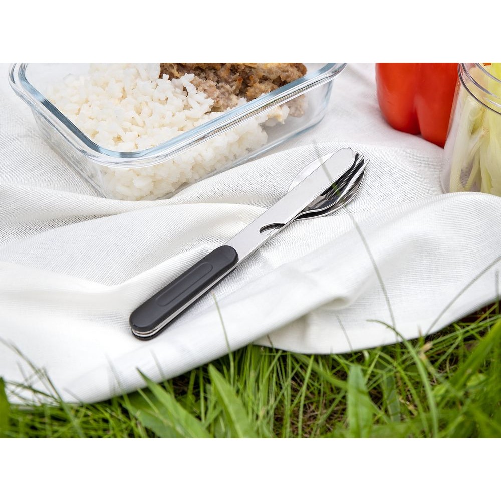 Набор столовых приборов из ложки, вилки и ножа с открывашкой с разборной конструкцией.