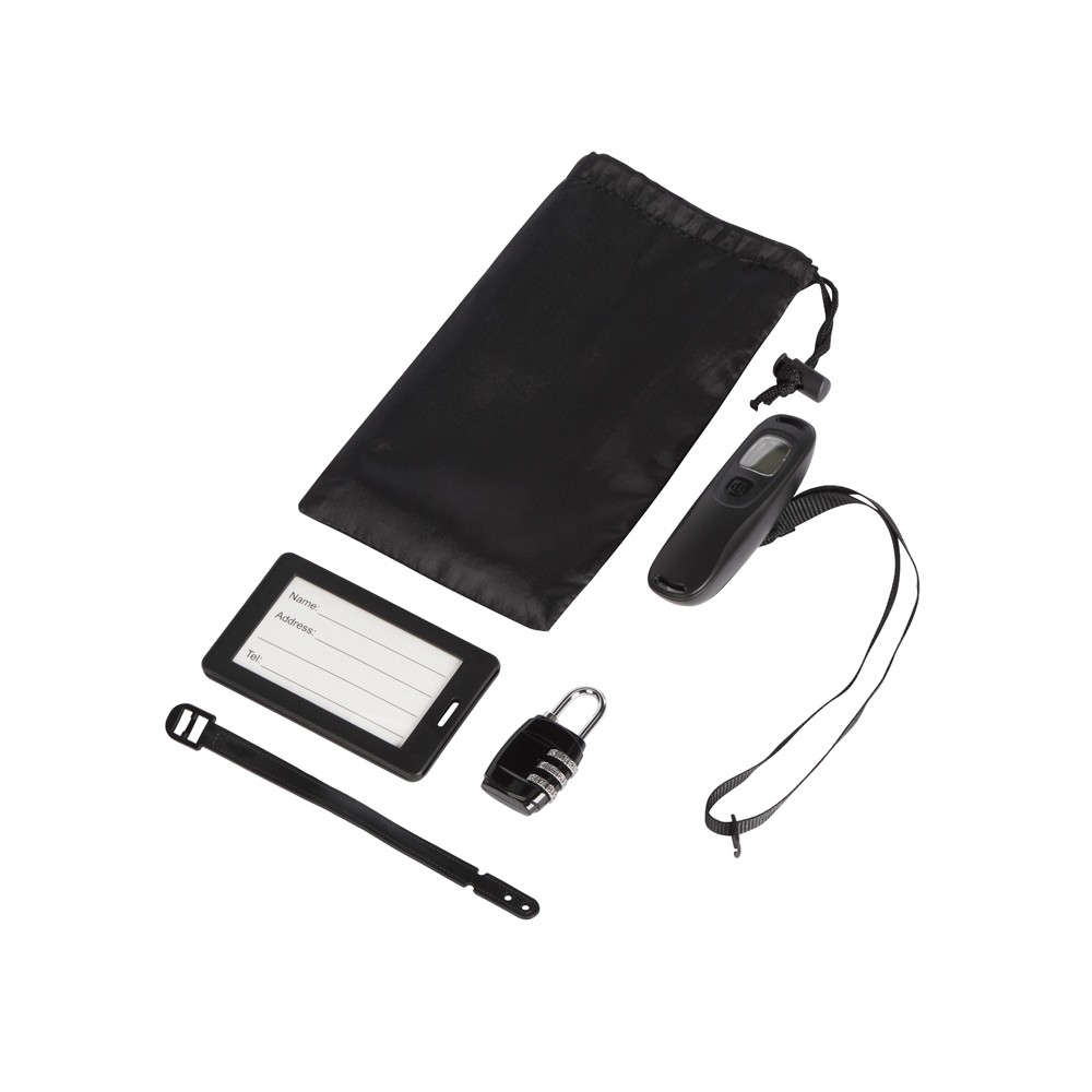 В набор входит всё самое необходимое в путешествии: багажные весы, бирка и замок. Особенно набор будет актуален, если вы летите самолётом. Ведь совсем неудобно узнавать о том, что есть перевес, когда уже приехали в аэропорт. Намного приятнее взвесить чемодан заранее, дома или в отеле, и переложить или убрать лишние вещи. Максимальная нагрузка весов до 50 кг. Если вы владелец достаточно строгого и классического чемодана, то бирка поможет не перепутать свой багаж с чужим. А ещё она очень приятная на ощупь. Замок же надёжно защитит ваши вещи от кражи. Все предметы сложены в компактный мешочек на затяжке, который удобно взять с собой, и он прекрасно подходит для брендирования. • Самое необходимое для сбора и безопасности багажа • Компактные размеры • Идея подарка людям, часто бывающим в командировках