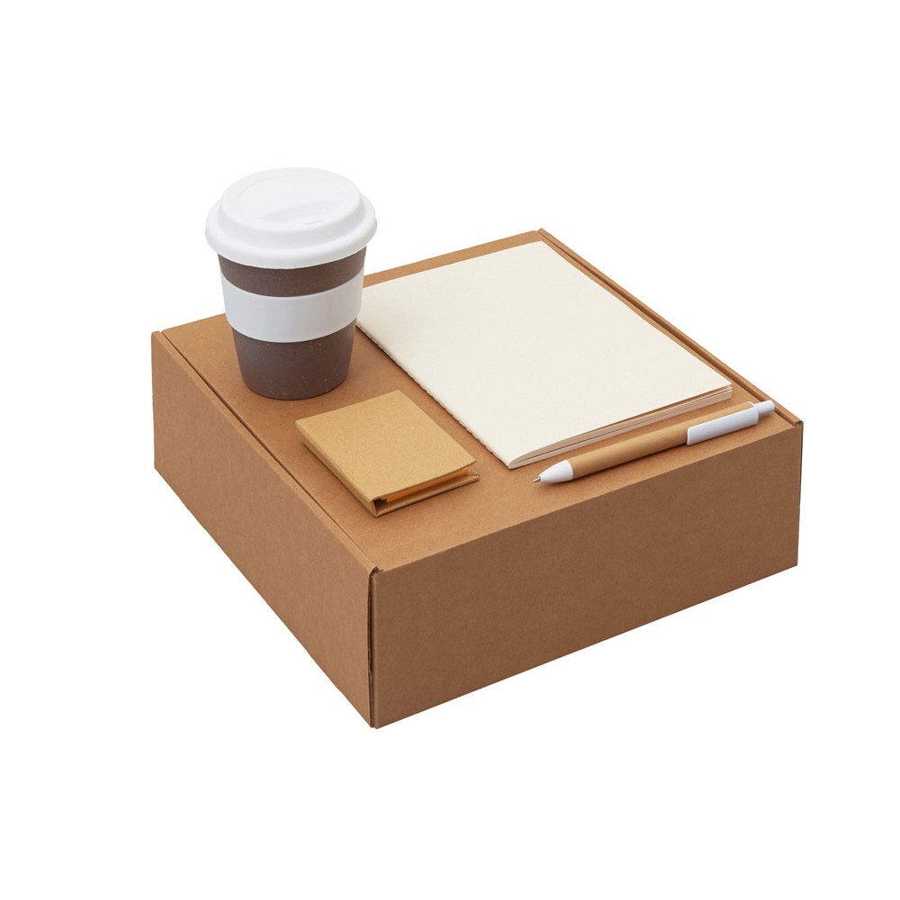 | Материал товара | блокнот- бумага из переработанных тетра-паков, ручка- картон, пластик, стакан- 50% бамбуковое волокно, 50% полипропилен, коробка- картон |