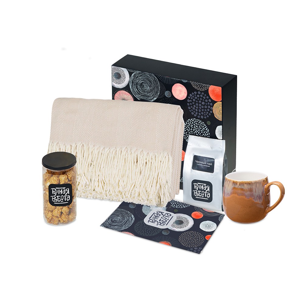 | Вес1172 | Материал товараплед - 100% хлопок, кружка - костяной фарфор с покрытием софт-тач, чай - пластик, попкорн - пластик, металл, мешок - нетканый материал (спанбонд), коробка - картон | Материалы товараметалл,хлопок,пластик,фарфор,картон,soft-touch/софт-тач,нетканый материал |