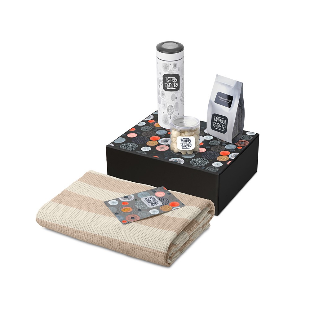 | Материал товара | плед - 100% хлопок, термос - нержавеющая сталь с покрытием софт-тач, чай - пластик, мешок - нетканый материал (спанбонд), коробка - картон |